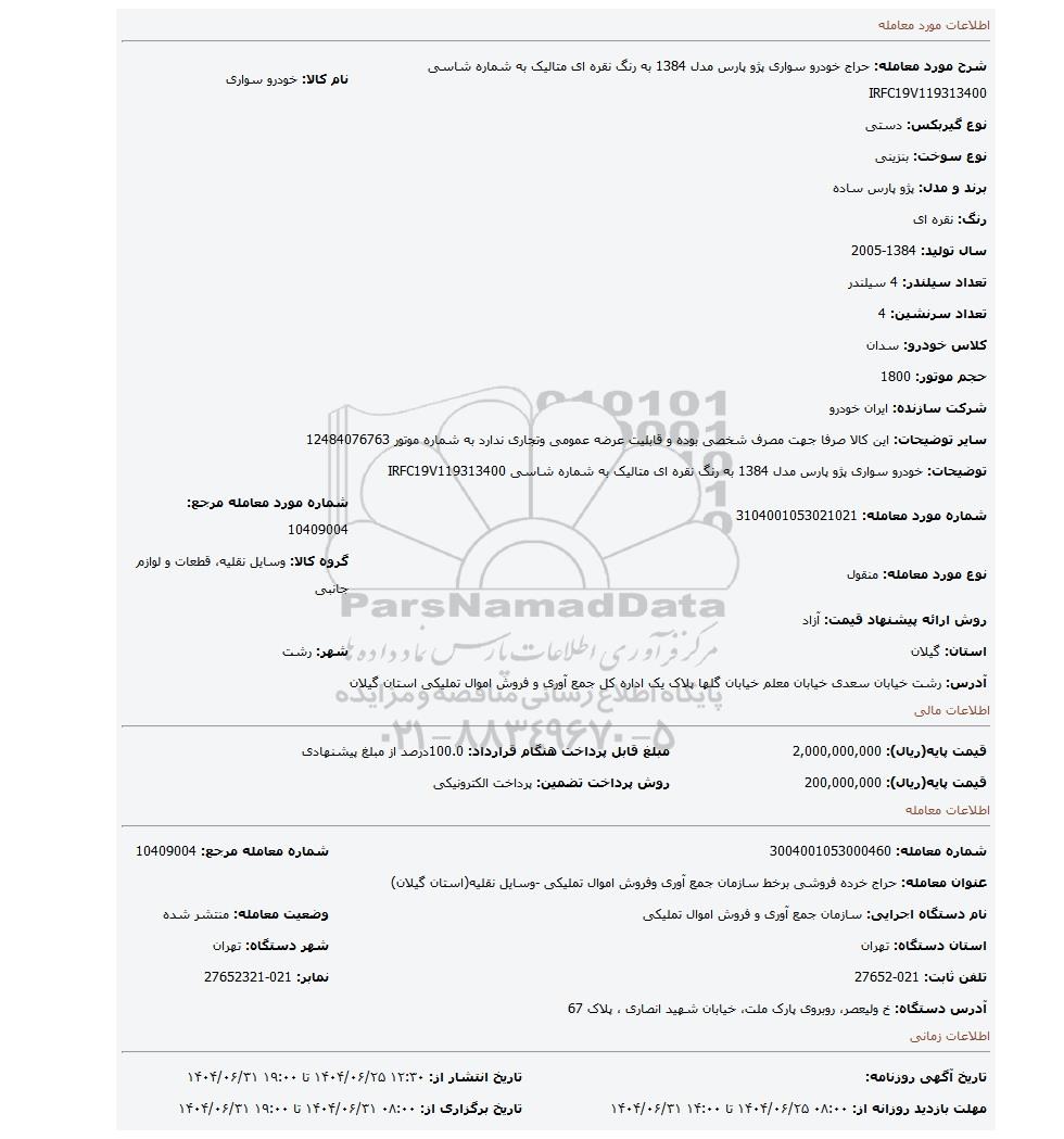 | شرح مورد معامله: حراج خودرو سواری پژو پارس مدل 1384 به رنگ نقره ای متالیک به شماره شاسی IRFC19V119313400 | نام کالا: خودرو سواری | |