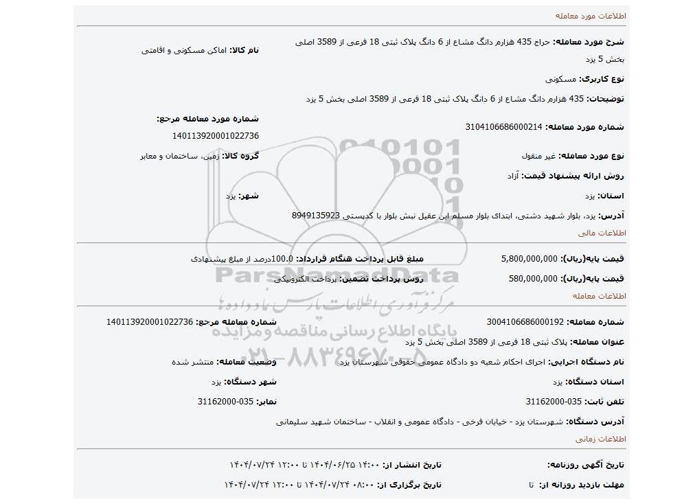 مزایده 435 هزارم دانگ مشاع از 6 دانگ پلاک ثبتی 18 فرعی از 3589 اصلی بخش 5 یزد, مزایده، 435 هزارم دانگ مشاع از 6 دانگ پلاک ثبتی 18 فرعی از 3589 اصلی بخش 5 یزد