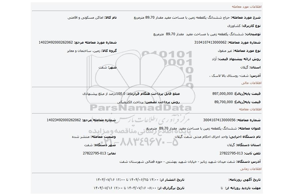 | شرح مورد معامله: حراج ششدانگ یکقطعه زمین با مساحت مفید مقدار 89.70 مترمربع | نام کالا: اماکن مسکونی و اقامتی | |
