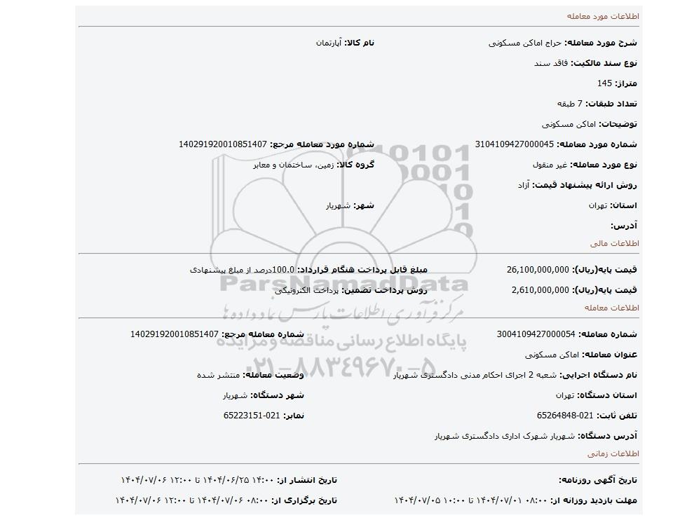 | شرح مورد معامله: حراج اماکن مسکونی | نام کالا: آپارتمان | |