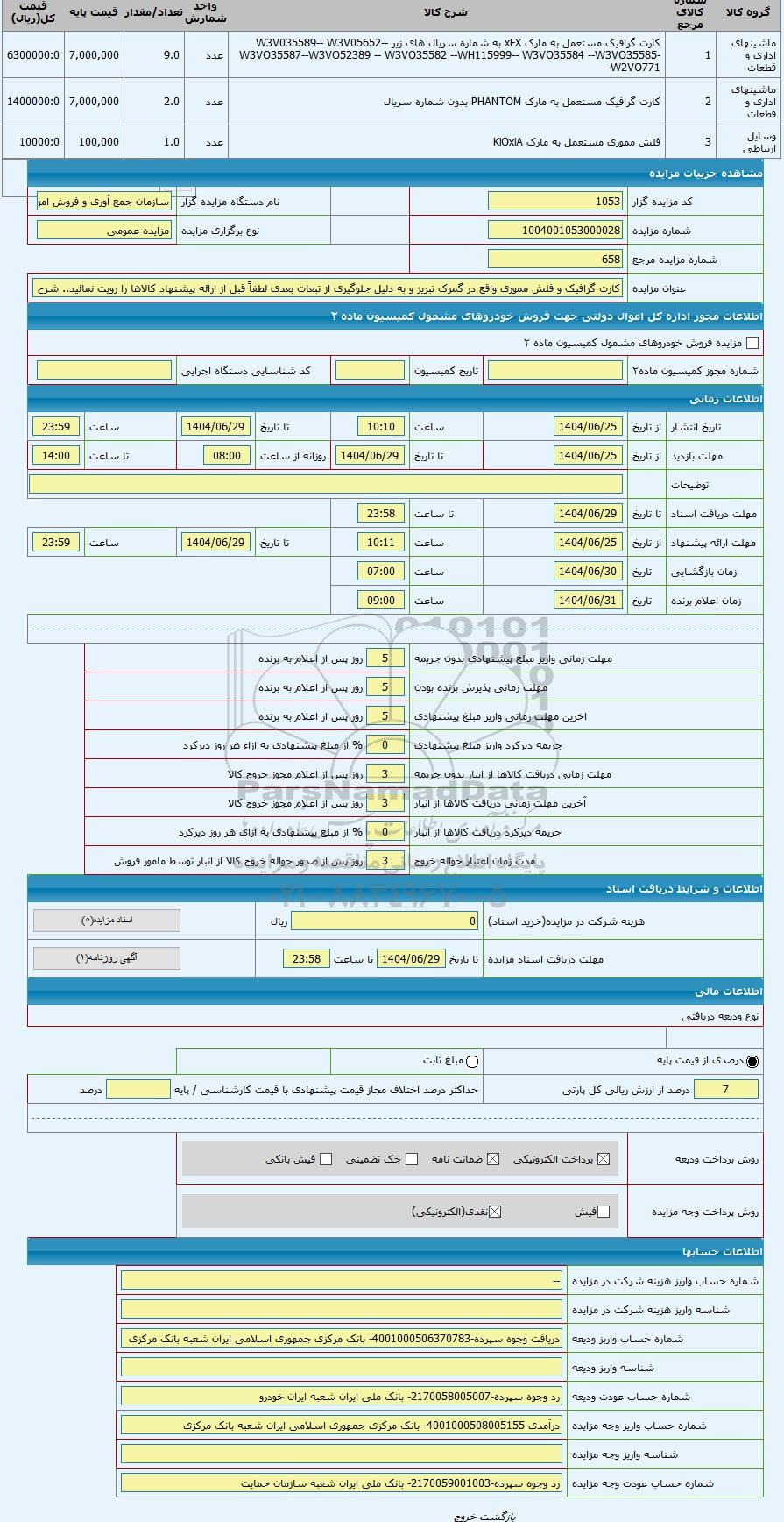 عنوان مزایدهکارت گرافیک و فلش مموری واقع در گمرک تبریز و به دلیل جلوگیری از تبعات بعدی لطفاً قبل از ارائه پیشنهاد کالاها را رویت نمائید.