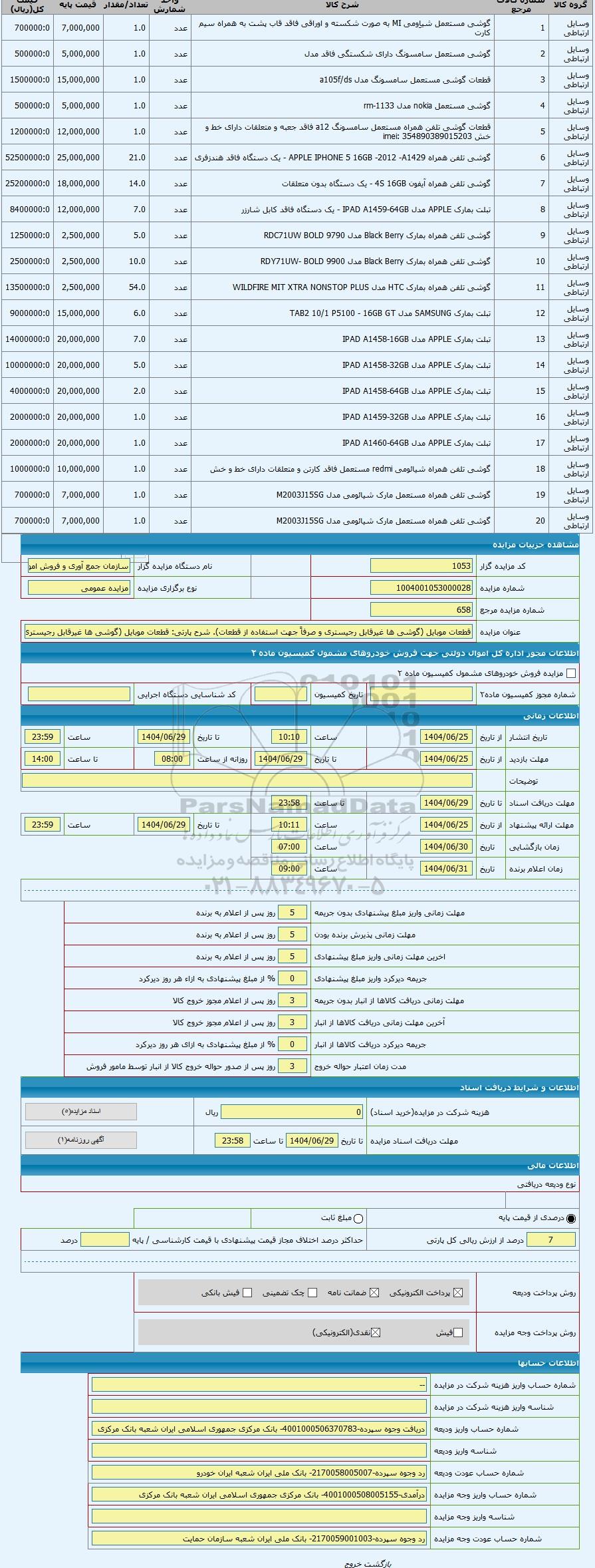 | عنوان مزایده | قطعات موبایل (گوشی ها غیرقابل رجیستری و صرفاً جهت استفاده از قطعات) | |||