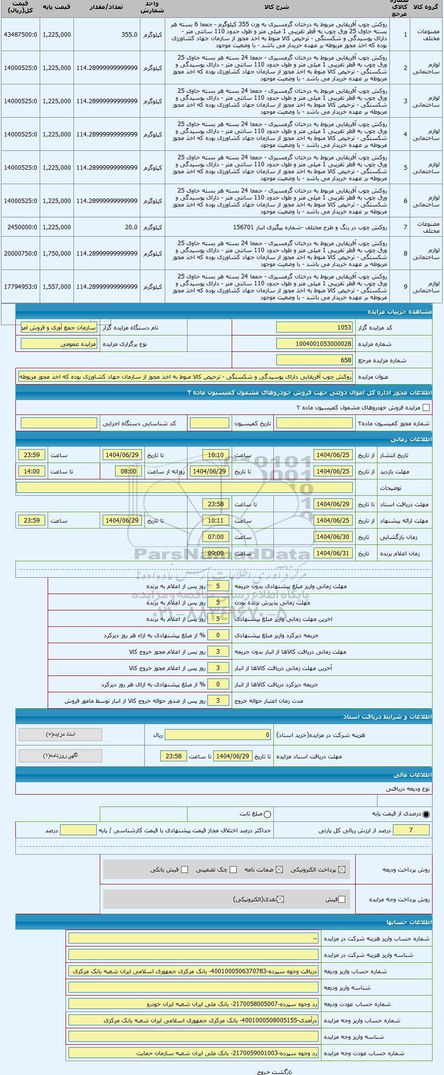 مزایده ، روکش چوب آفریقایی دارای پوسیدگی و شکستگی - ترخیص کالا منوط به اخذ مجوز از سازمان جهاد کشاورزی بوده که اخذ مجوز مربوطه ب