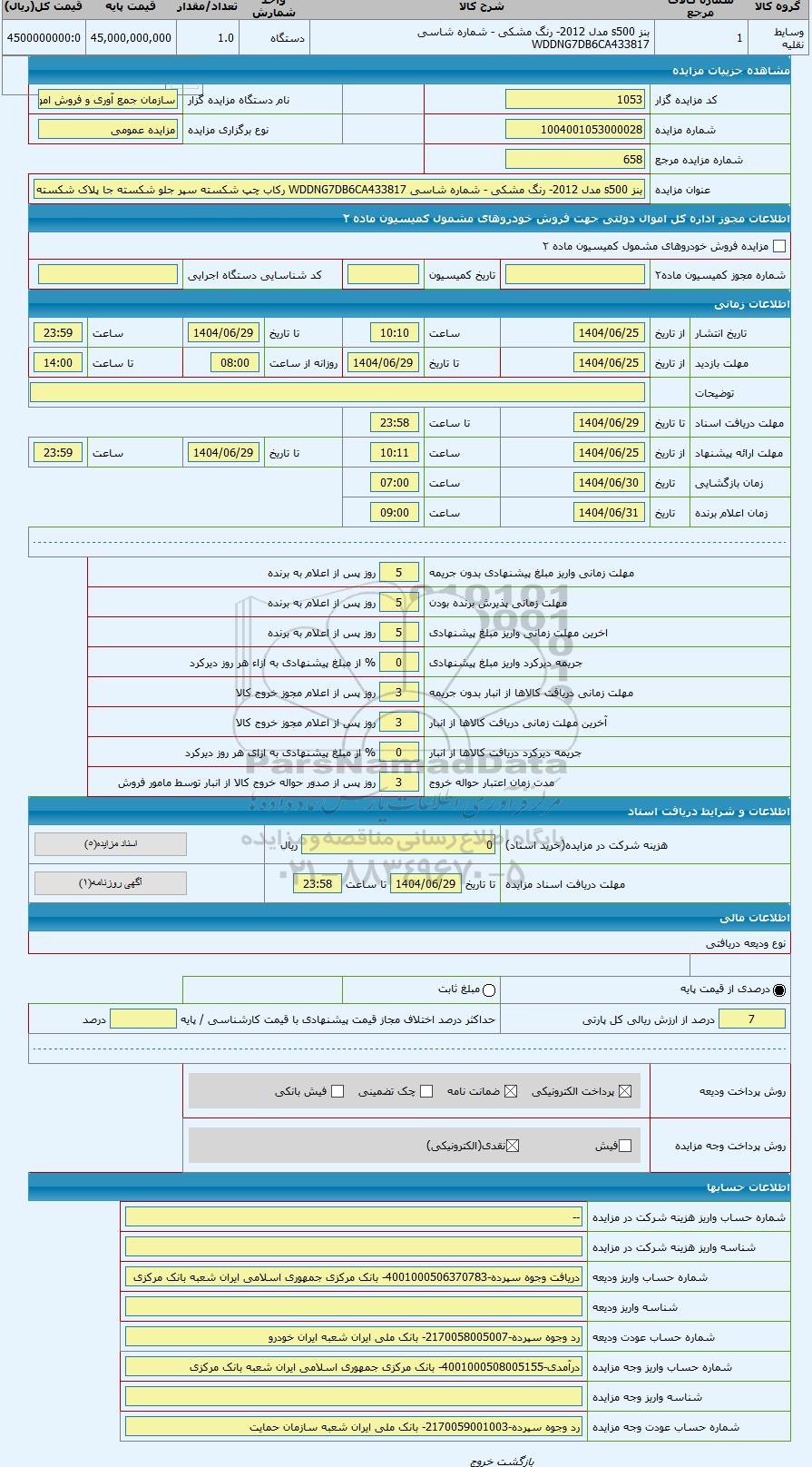 | وسایط نقلیه | 1 | بنز s500 مدل 2012- رنگ مشکی - شماره شاسی WDDNG7DB6CA433817 | دستگاه | 1.0 | 45,000,000,000 | 4500000000:0 |