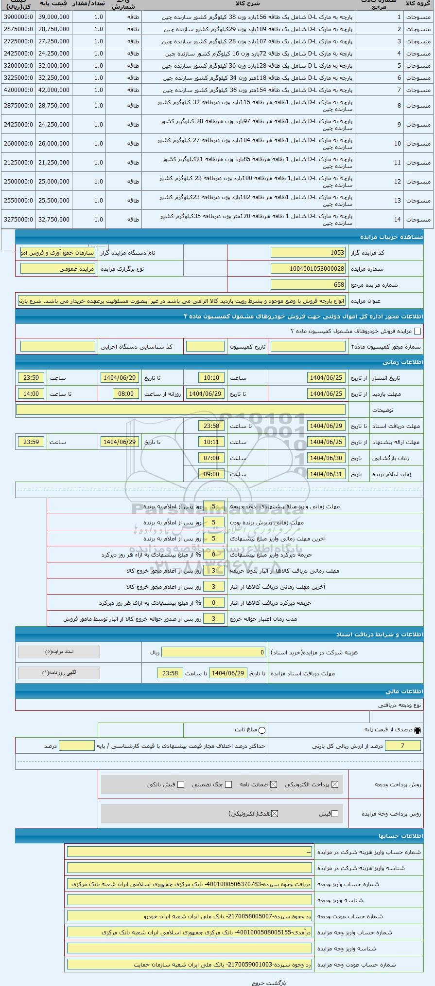| کد مزایده گزار | 1053 | نام دستگاه مزایده گزار | سازمان جمع آوری و فروش اموال تملیکی | |