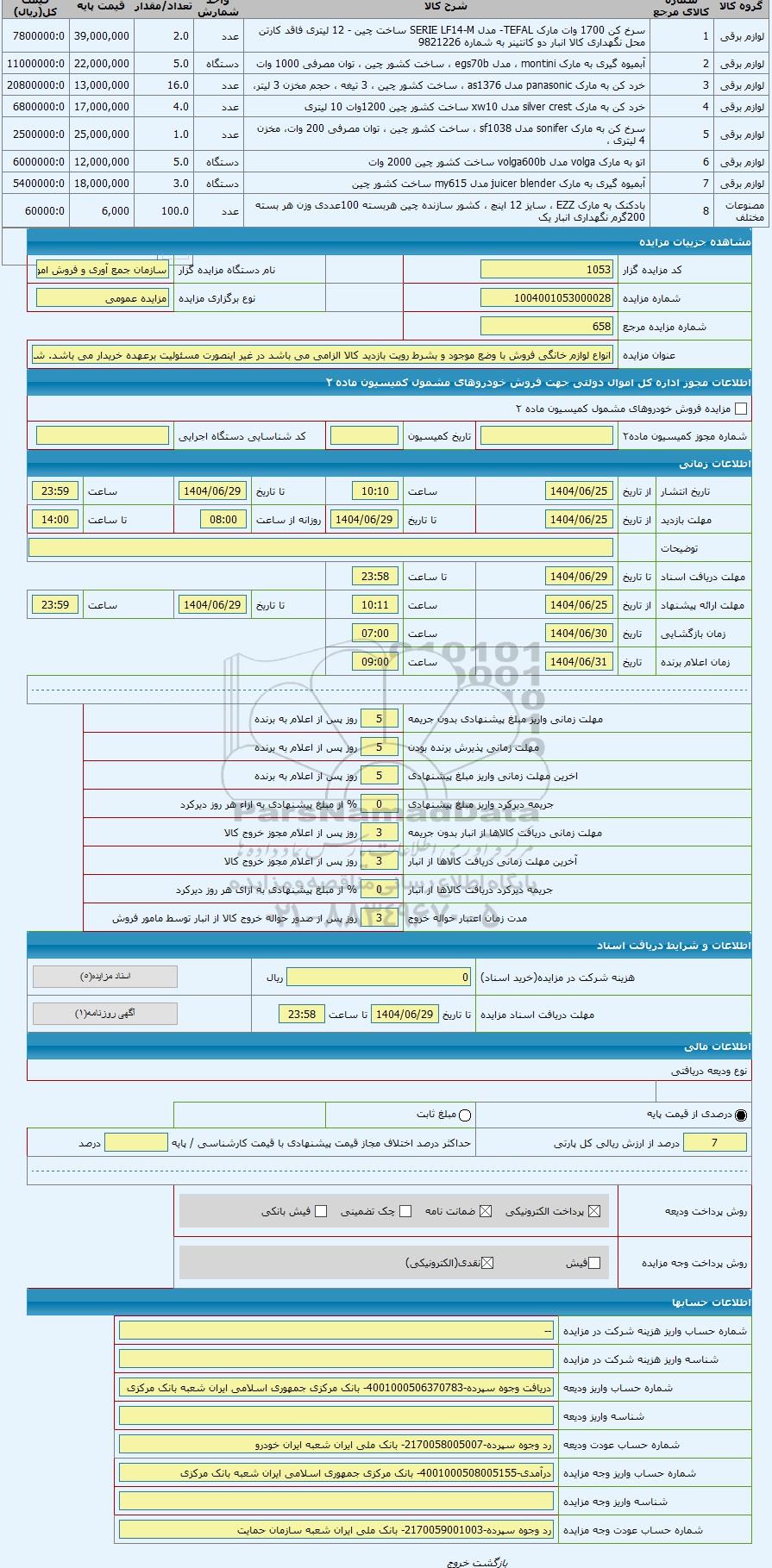 | کد مزایده گزار | 1053 | نام دستگاه مزایده گزار | سازمان جمع آوری و فروش اموال تملیکی | |