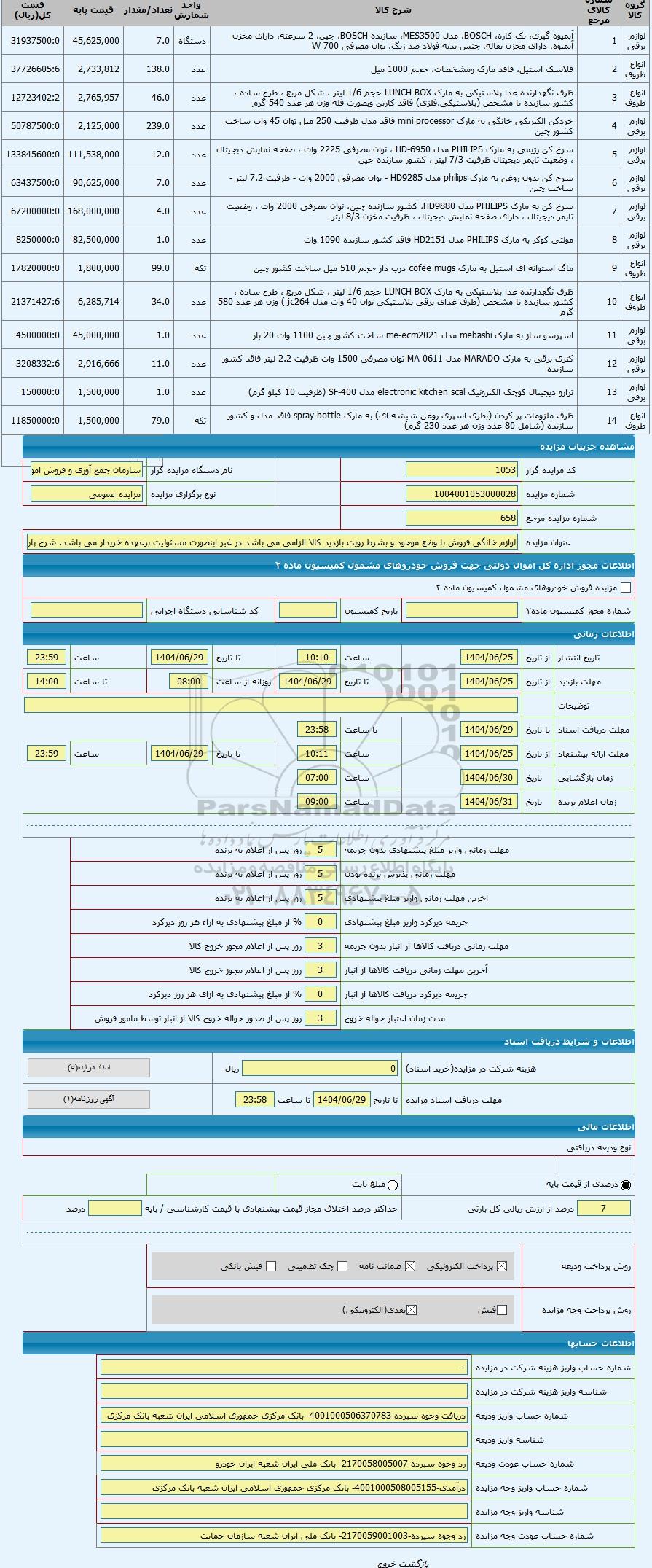 مزایده عمومی مزایده لوازم خانگی فروش با وضع موجود و بشرط رویت بازدید کالا الزامی می باشد در غیر اینصورت مسئولیت برعهده خریدار می باشد برگزار میگردد. از کلیه افراد متخصص و شرکتهای واجد شرایط دعوت به عمل میآید تا در این مزایده با کد خبرگزاری پارس نماد : 9558468 شرکت نمایند تاریخ شروع مزایده : 1404/06/25 مهلت شرکت در مزایده: تا پایان روز 1404/06/29 مکان برگزاری اموال واگذاری استانهای چهارمحال و بختیاری و دستهبندیهای مربوط به این حراجی متفرقه میباشد.