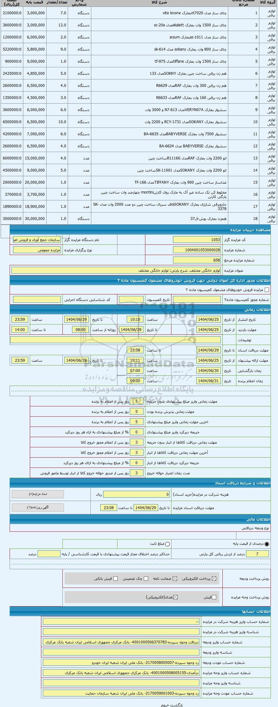 مزایده لوازم خانگی مختلف, مزایده ، لوازم خانگی مختلف