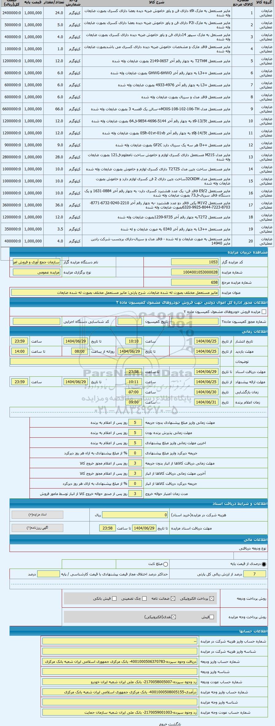 | ضایعات عملیاتی | 7 | ماینر مستعمل +L3 به چهار رقم آخر 4976-4933 بصورت ضایعات وله شده | کیلوگرم | 6.0 | 1,000,000 | 600000:0 |