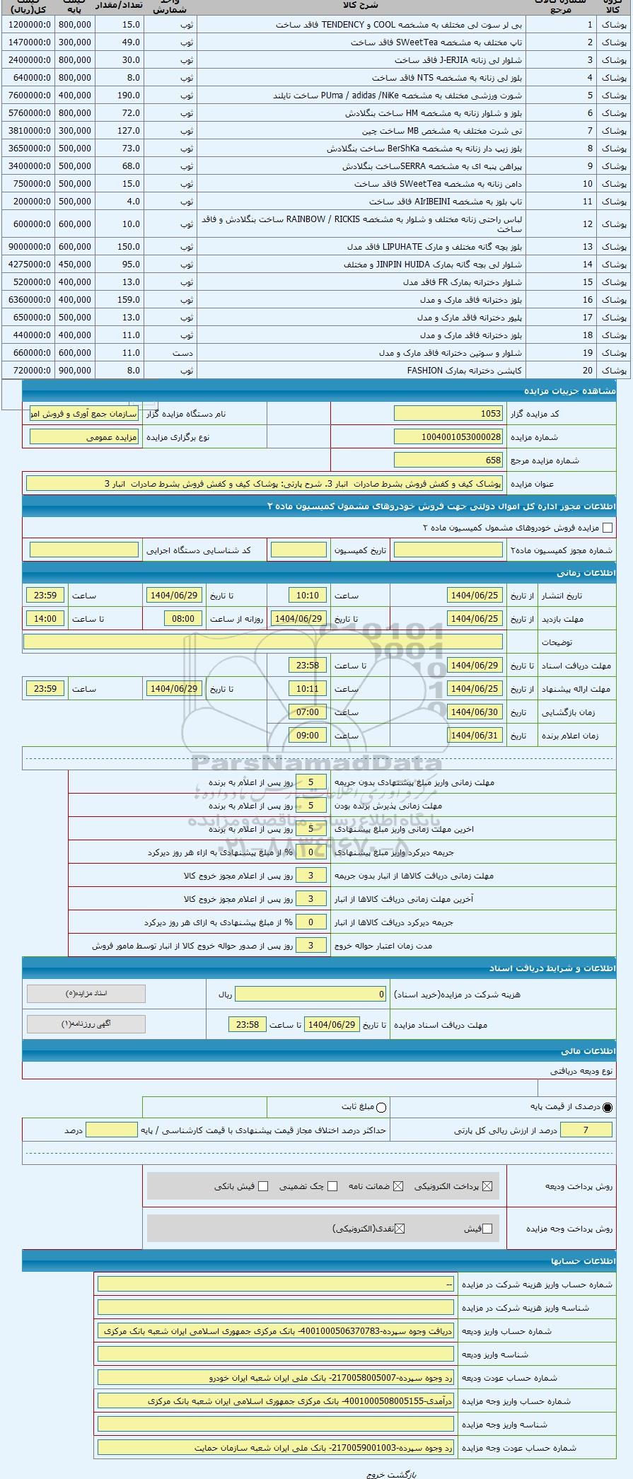 | عنوان مزایده | پوشاک کیف و کفش فروش بشرط صادرات انبار 3 | |||