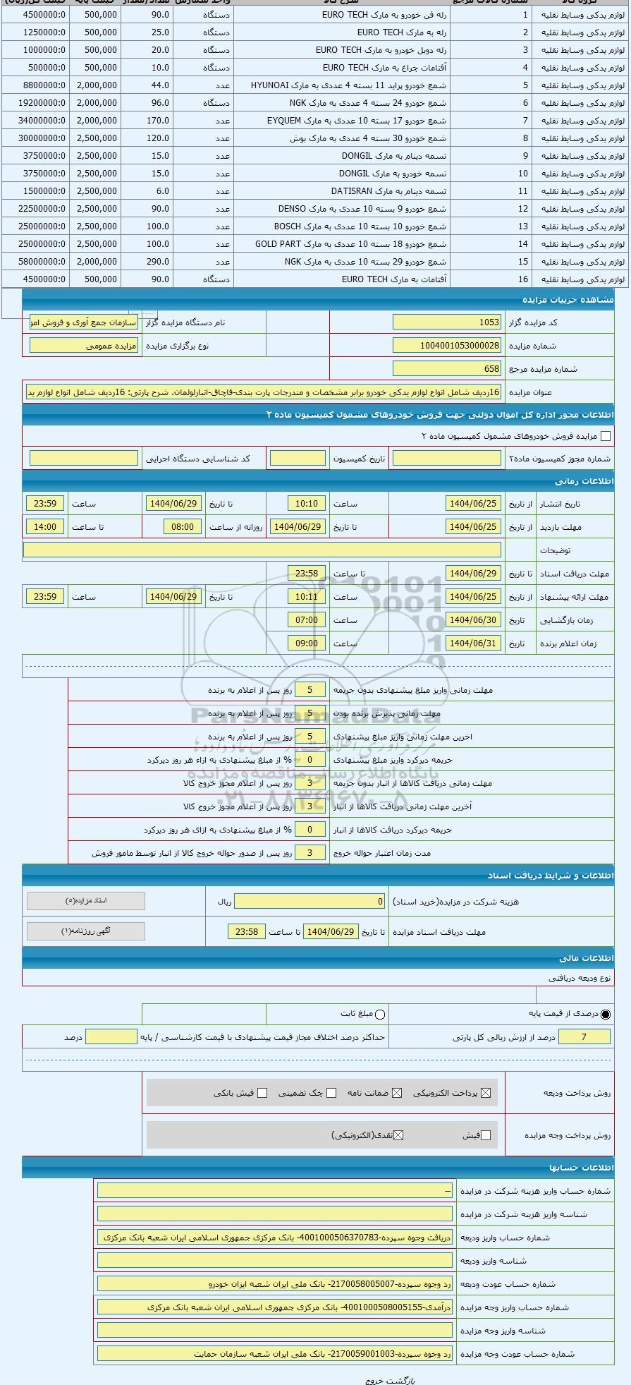| عنوان مزایده | 16ردیف شامل انواع لوازم یدکی خودرو برابر مشخصات و مندرجات پارت بندی-قاچاق-انبارلولمان | |||