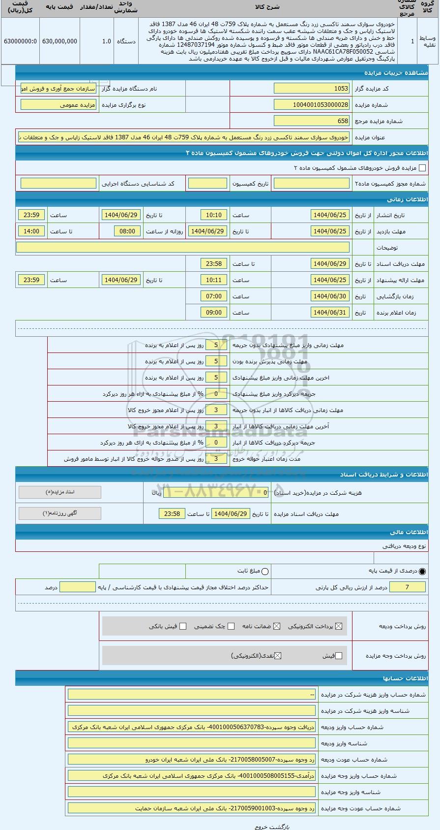 | کد مزایده گزار | 1053 | نام دستگاه مزایده گزار | سازمان جمع آوری و فروش اموال تملیکی | |