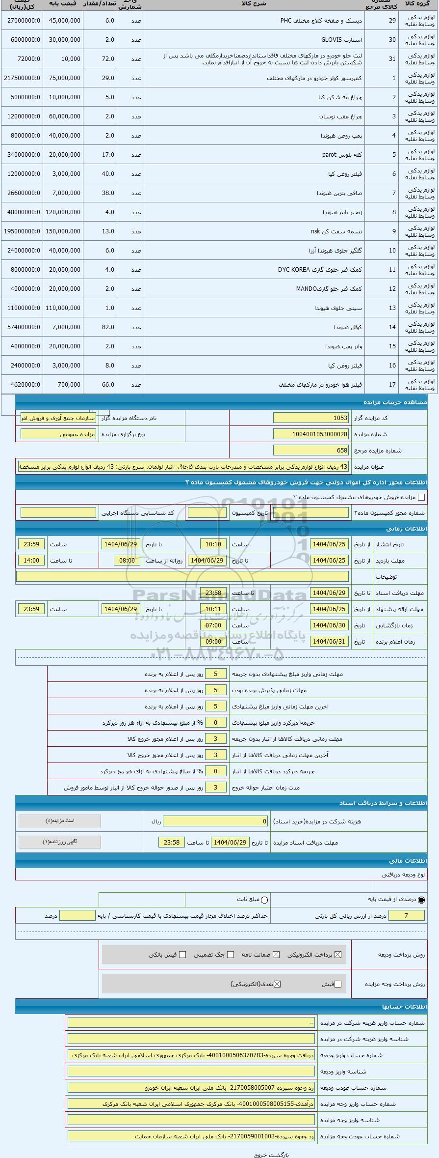 | عنوان مزایده | 43 ردیف انواع لوازم یدکی برابر مشخصات و مندرجات پارت بندی-قاچاق -انبار لولمان | |||