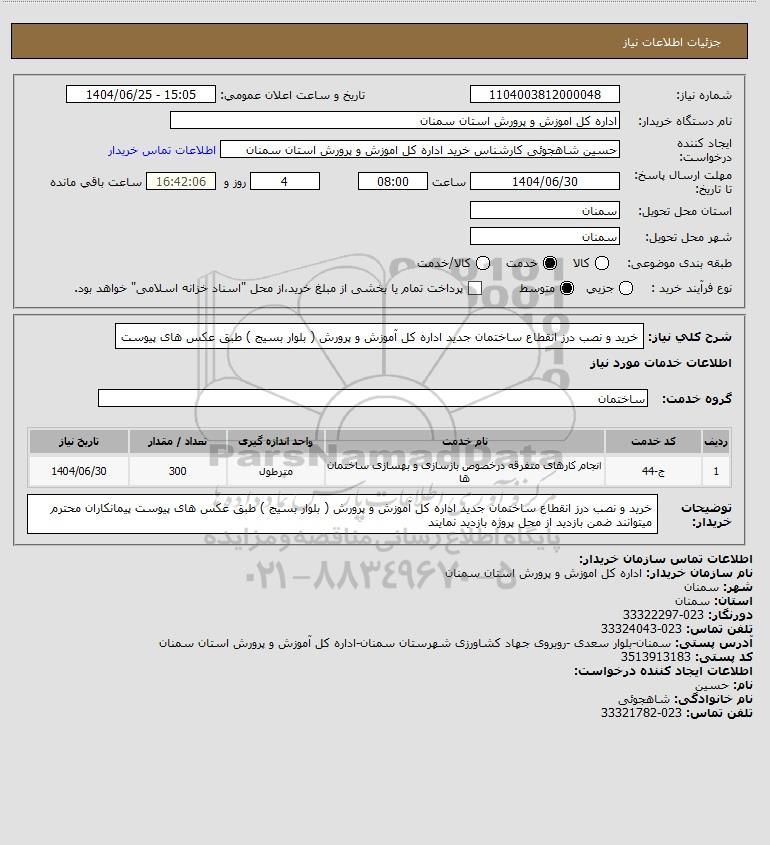 توضیحات خریدار:خرید و نصب درز انقطاع ساختمان جدید اداره کل آموزش و پرورش ( بلوار بسیج ) طبق عکس های پیوست