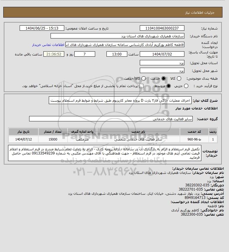 شرح کلی نیاز: اجرای عملیات خاکی فاز۳ پارت D پروژه معابر کاریزبوم طبق شرایط و ضوابط فرم استعلام پیوست