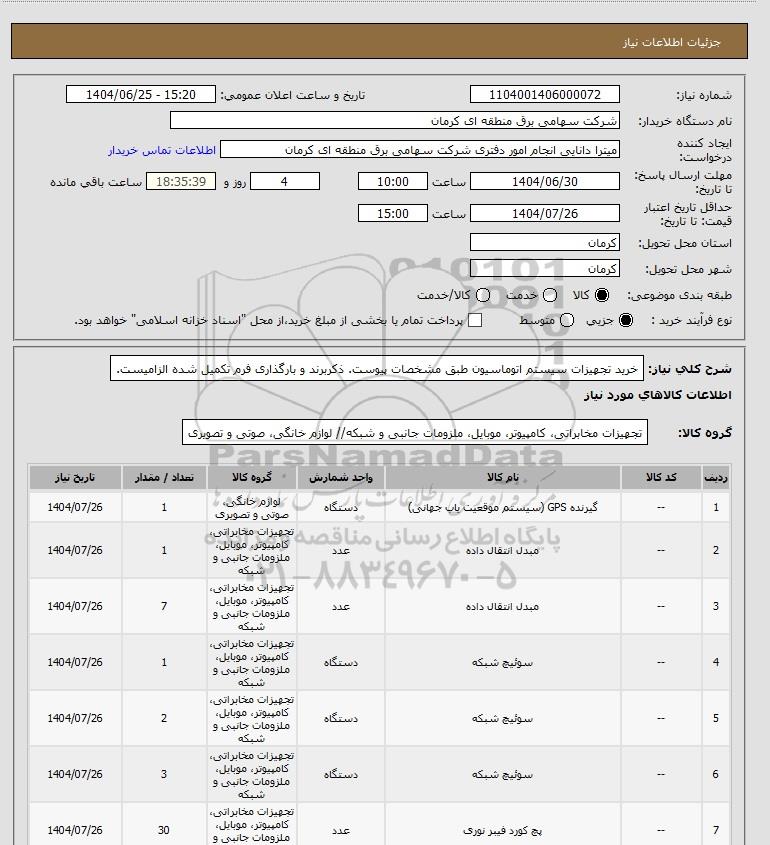 نام دستگاه خریدار:شرکت سهامی برق منطقه ای کرمان