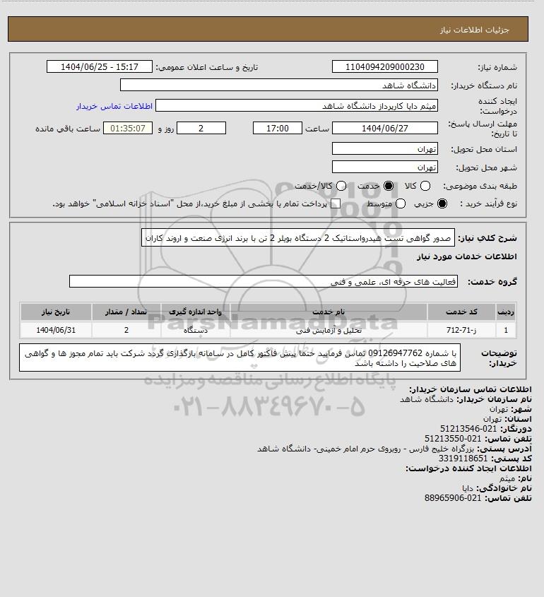 شرح کلی نیاز: صدور گواهی تست هیدرواستاتیک