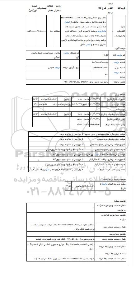 | عنوان مزایده | ماکرو ویو خانگی بوش BOSCH مدل HMT84G451 | |||