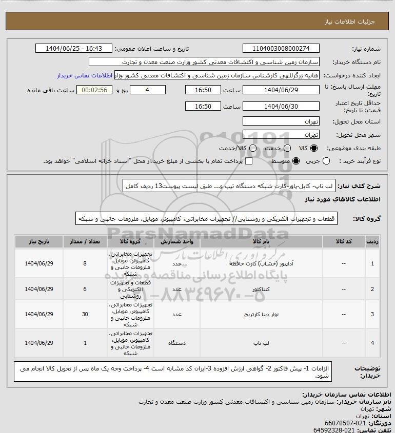 | 3 | -- | نوار دیتا کارتریج | عدد | تجهیزات مخابراتی، کامپیوتر، موبایل، ملزومات جانبی و شبکه | 30 | 1404/06/29 |