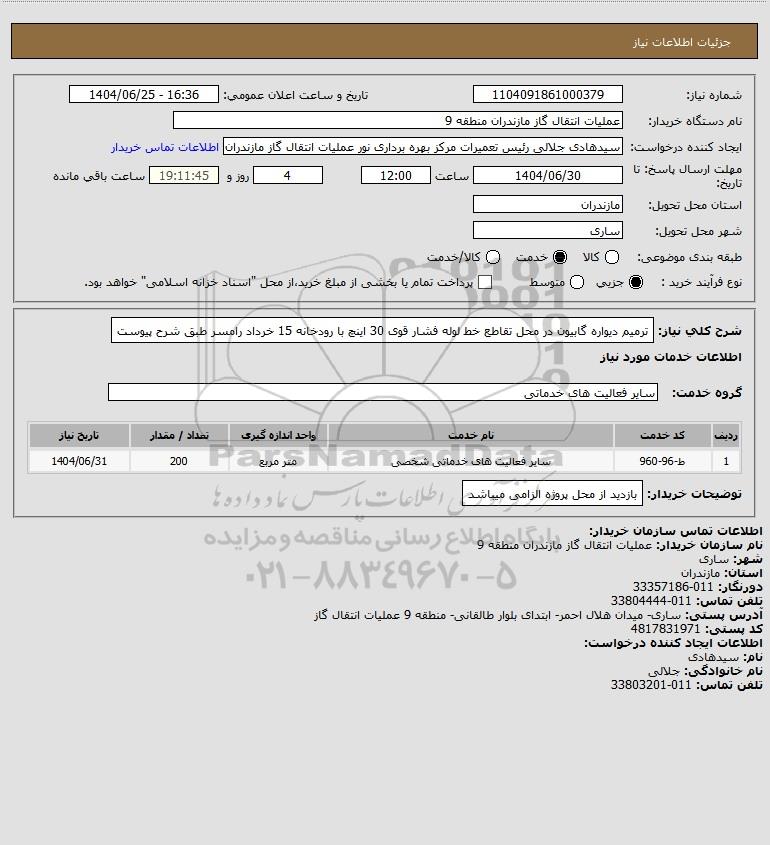 شرح کلی نیاز: ترمیم دیواره گابیون در محل تقاطع خط لوله فشار قوی 30 اینچ با رودخانه 15 خرداد رامسر طبق شرح پیوست