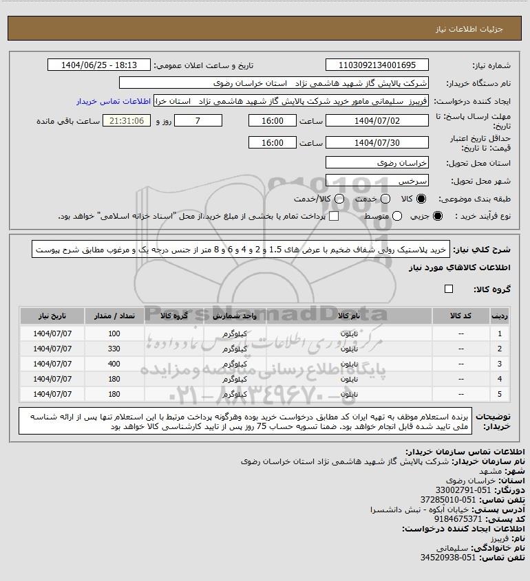 نام دستگاه خریدار:شرکت پالایش گاز شهید هاشمی نژاد استان خراسان رضوی