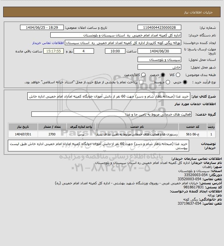 شرح کلی نیاز: خرید غذا (صبحانه ناهار شام و دسر) جهت 60 نفر از دانش آموزان خوابگاه کمیته اماداد امام خمینی اداره خاش