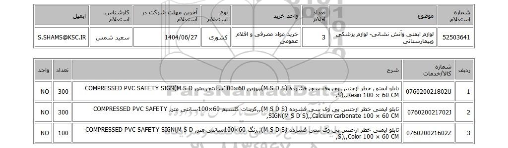 | 52503641 | لوازم ایمنی وآتش نشانی- لوازم پزشکی وبیمارستانی | 3 | خرید مواد مصرفی و اقلام عمومی | کشوری | 1404/06/27 | سعید شمس | S.SHAMS@KSC.IR |