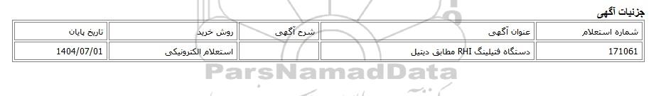| 171061 | دستگاه فتیلینگ RHI مطابق دیتیل | استعلام الکترونیکی | 1404/07/01 |