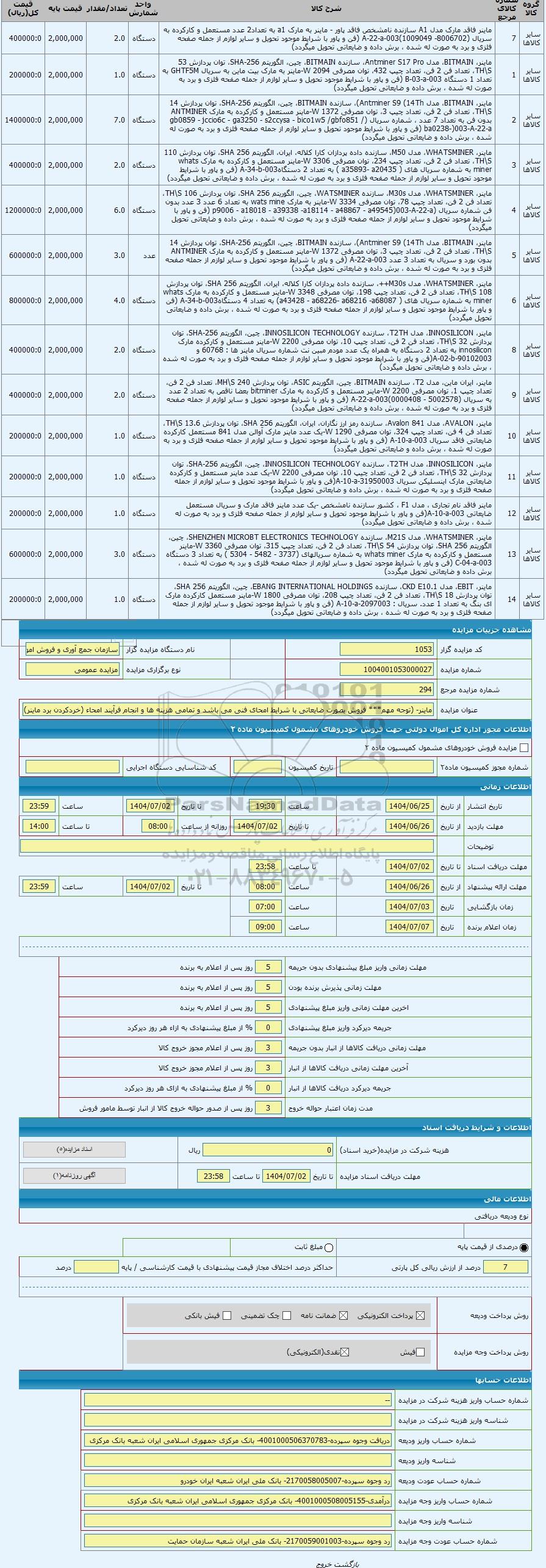 مزایده عمومی مزایده ماینر- (توجه مهم*** فروش بصورت ضایعاتی با شرایط امحای فنی می باشد و تمامی هزینه ها و انجام فرآیند امحاء (خردکردن برد ما برگزار میگردد. از کلیه افراد متخصص و شرکت‌های واجد شرایط دعوت به عمل می‌آید تا در این مزایده با کد خبرگزاری پارس نماد : 9559447 شرکت نمایند تاریخ شروع مزایده : 1404/06/25 مهلت شرکت در مزایده: تا پایان روز 1404/07/02 مکان برگزاری اموال واگذاری استان‌های آذربایجان غربی و دسته‌بندی‌های مربوط به این حراجی کامپیوتر میباشد.