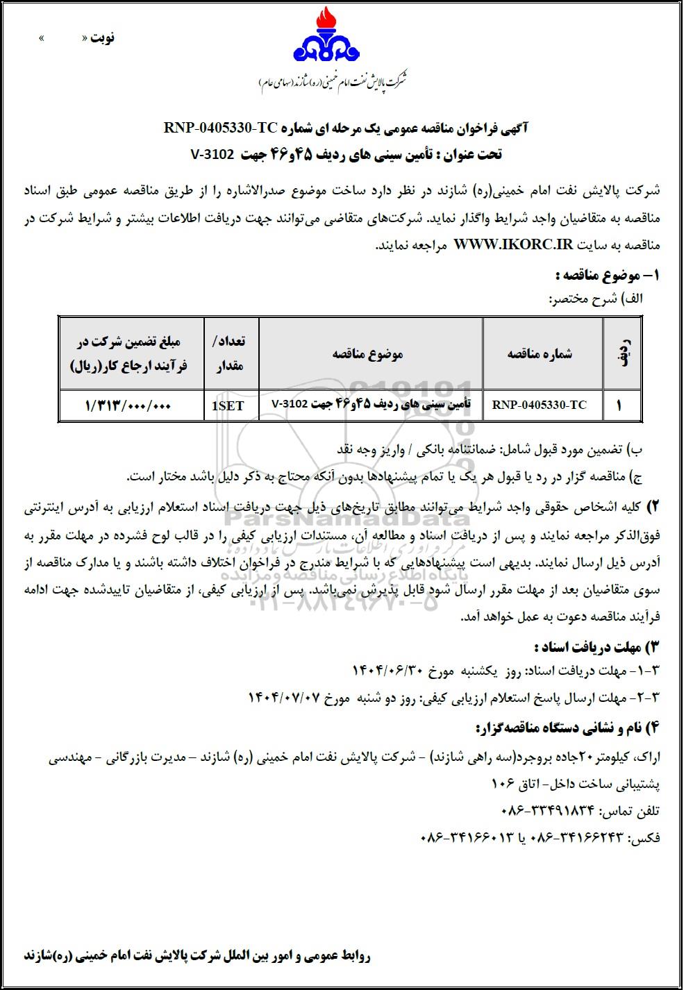 تحت عنوان : تامین سینی های ردیف 45 و 46 جهت V-3102