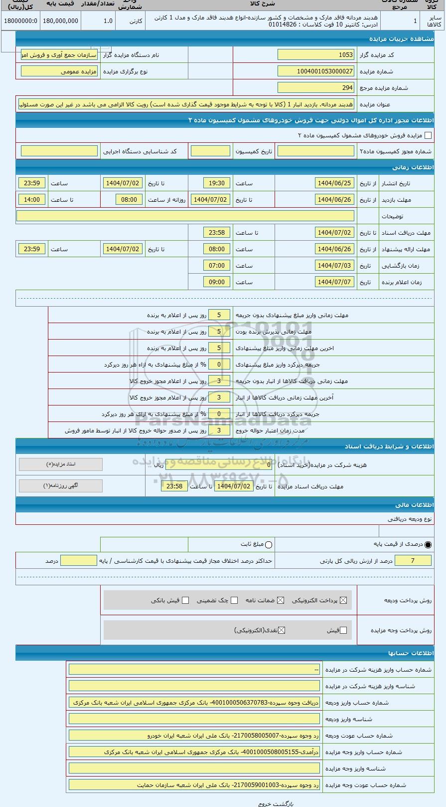 | کد مزایده گزار | 1053 | نام دستگاه مزایده گزار | سازمان جمع آوری و فروش اموال تملیکی | |