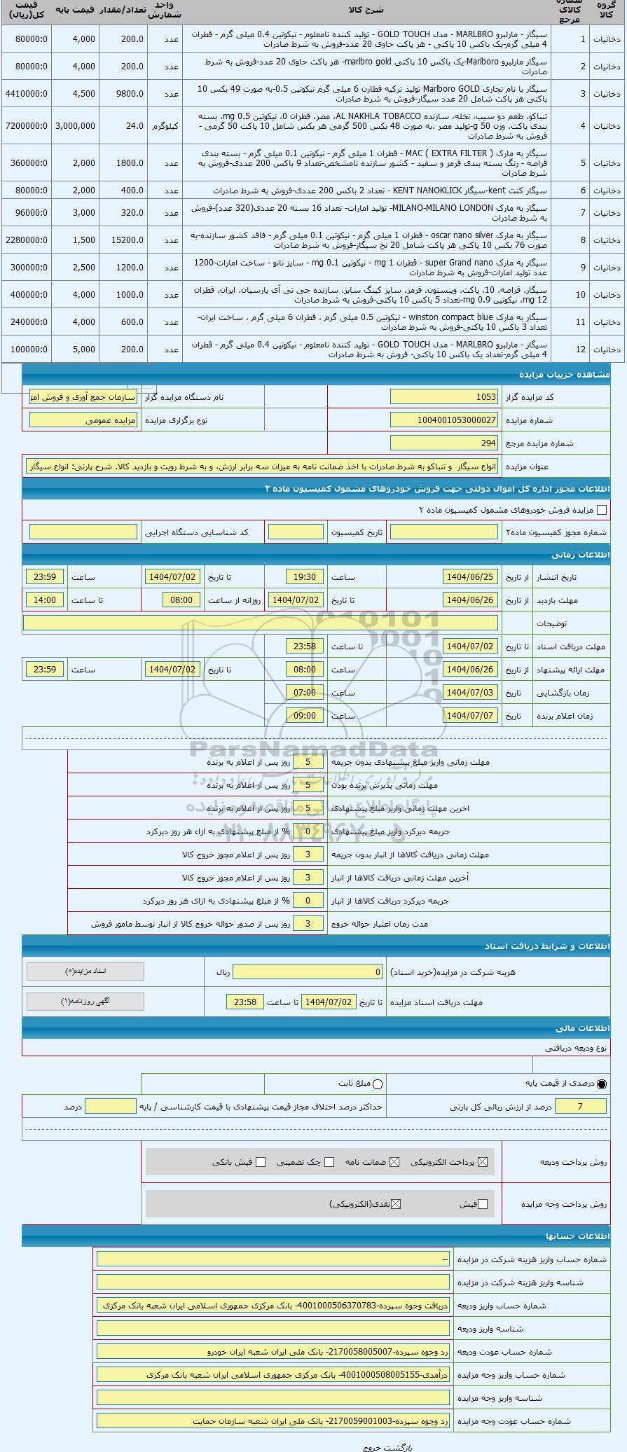 مزایده عمومی مزایده انواع سیگار و تنباکو به شرط صادرات با اخذ ضمانت نامه به میزان سه برابر ارزش و به شرط رویت و بازدید کالا برگزار میگردد. از کلیه افراد متخصص و شرکتهای واجد شرایط دعوت به عمل میآید تا در این مزایده با کد خبرگزاری پارس نماد : 9559523 شرکت نمایند تاریخ شروع مزایده : 1404/06/25 مهلت شرکت در مزایده: تا پایان روز 1404/07/02 مکان برگزاری اموال واگذاری استانهای ایلام و دستهبندیهای مربوط به این حراجی متفرقه میباشد.