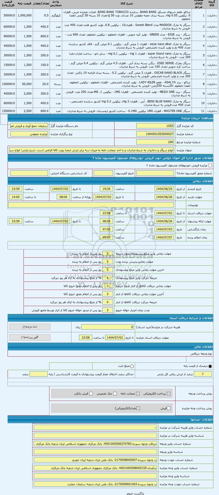 عنوان مزایدهانواع سیگار و دخانیات به شرط صادرات و با اخذ ضمانت نامه به میزان سه برابر ارزش ضمنا رویت کالا الزامی است