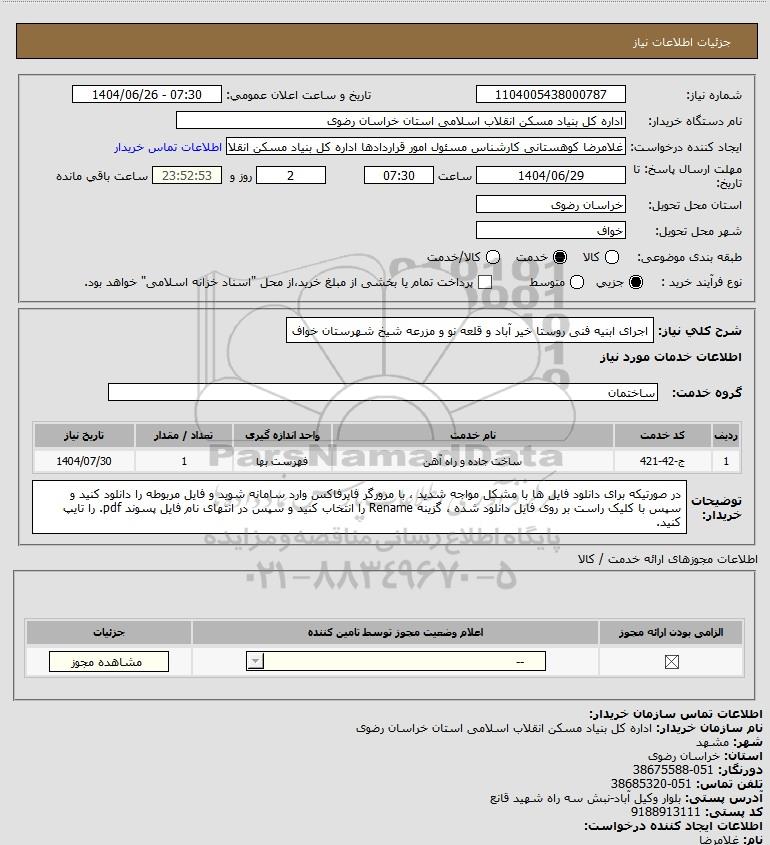 شرح کلی نیاز: اجرای ابنیه فنی روستا خیر آباد و قلعه نو و مزرعه شیخ شهرستان خواف