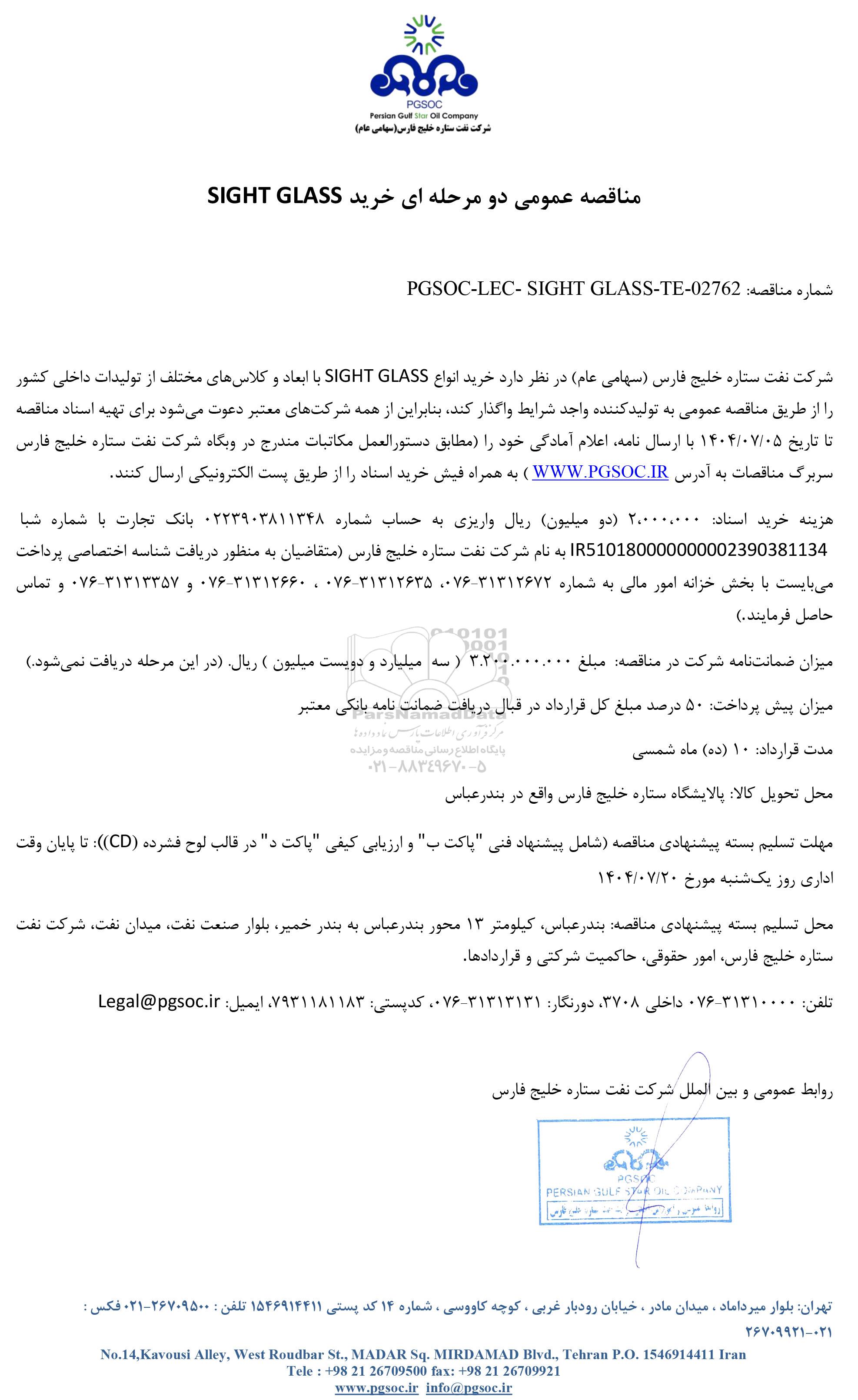 شماره مناقصه: PGSOC-LEC- SIGHT GLASS-TE- 02762