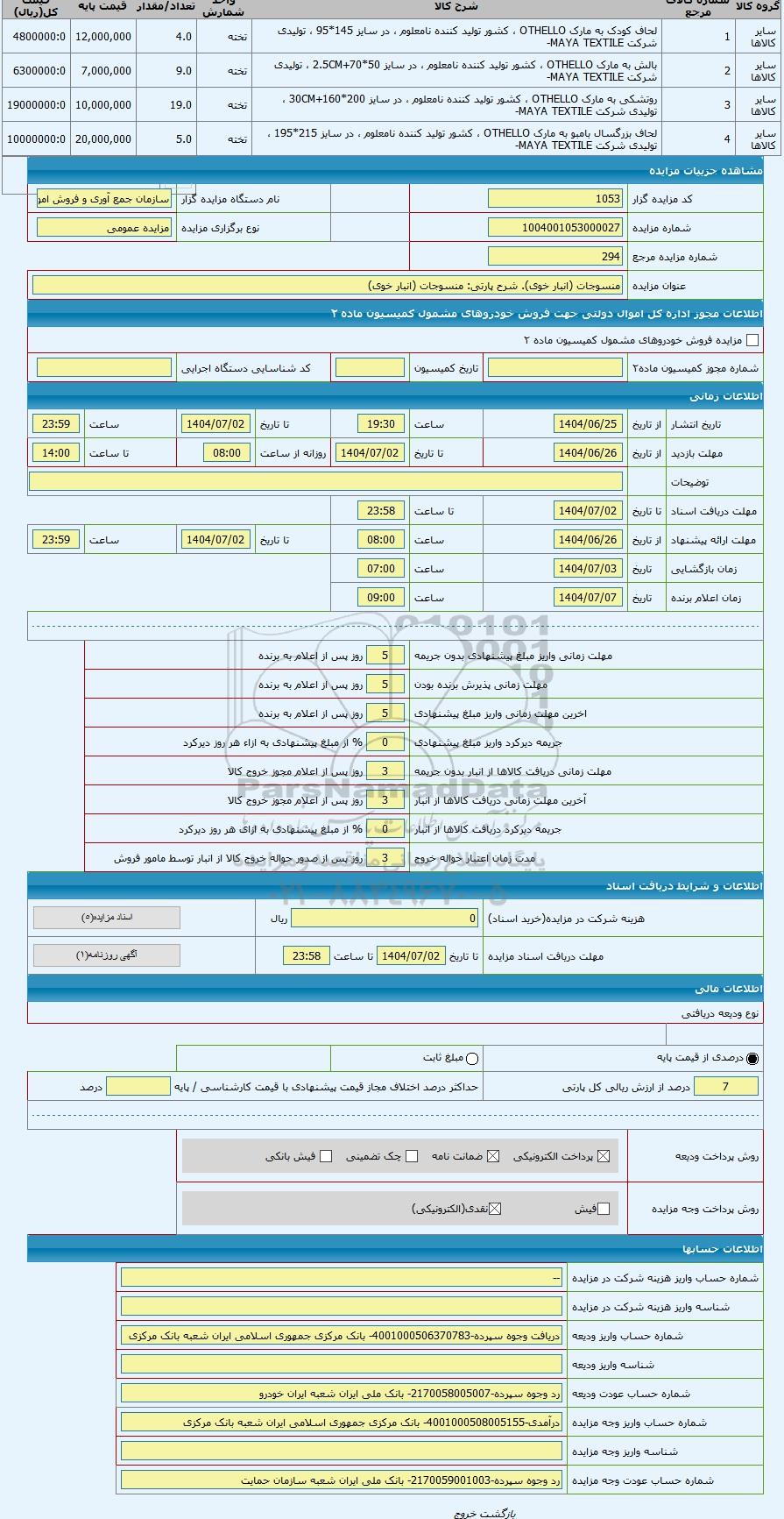| عنوان مزایده | منسوجات (انبار خوی) | |||