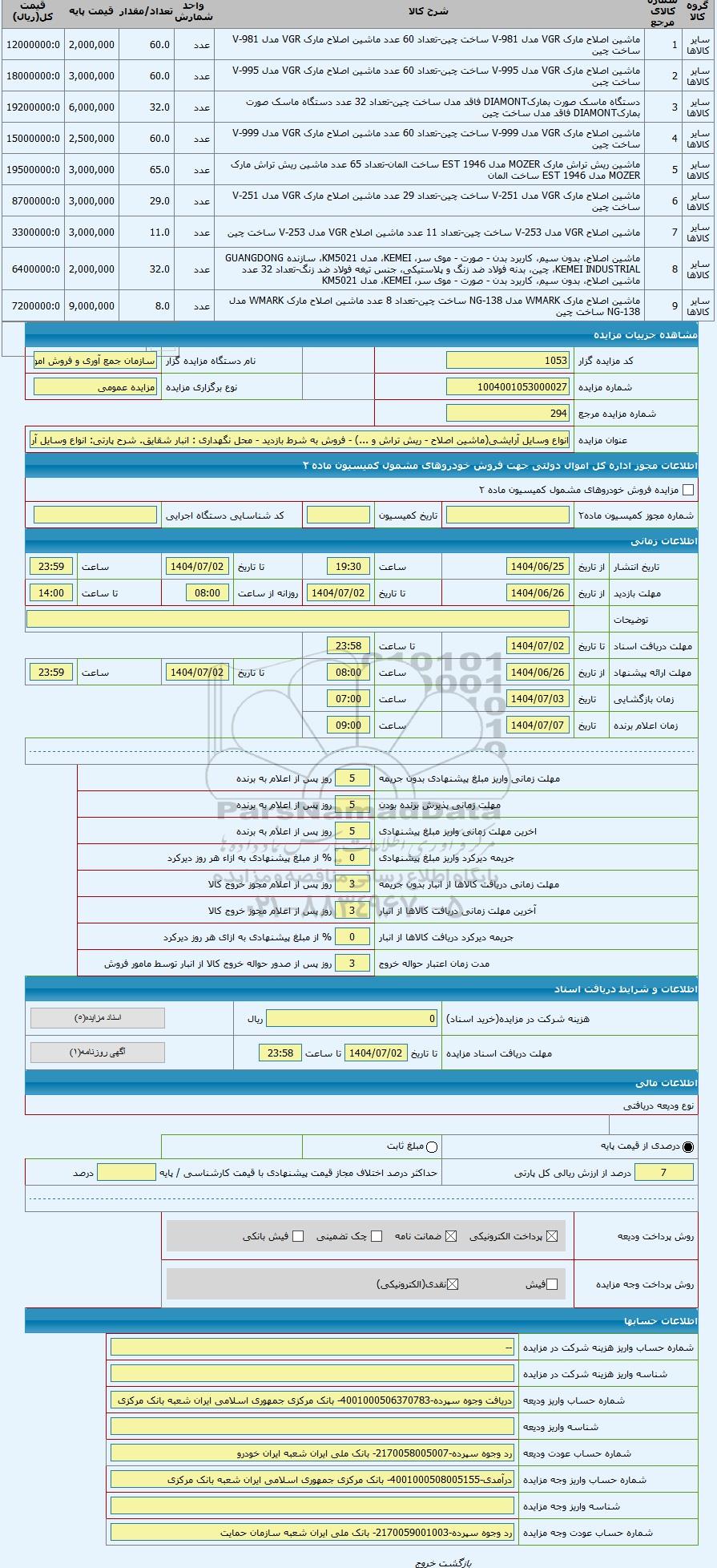 مزایده عمومی مزایده انواع وسایل آرایشی(ماشین اصلاح - ریش تراش و ...) - فروش به شرط بازدید - محل نگهداری : انبار شقایق برگزار میگردد. از کلیه افراد متخصص و شرکت‌های واجد شرایط دعوت به عمل می‌آید تا در این مزایده با کد خبرگزاری پارس نماد : 9559737 شرکت نمایند تاریخ شروع مزایده : 1404/06/25 مهلت شرکت در مزایده: تا پایان روز 1404/07/02 مکان برگزاری اموال واگذاری استان‌های لرستان و دسته‌بندی‌های مربوط به این حراجی متفرقه میباشد.