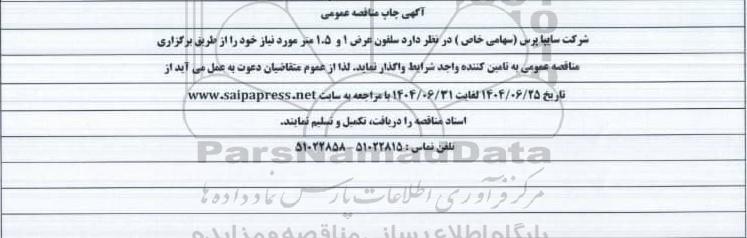 شرکت سایپا پرس (سهامی خاص) در نظر دارد سلفون عرض 1 و 1.5 متر مورد نیاز خود را از طریق برگزاری مناقصه عمومی به تامین کننده واجد شرایط واگذار نماید. لذا از عموم متقاضیان دعوت به عمل می آید از تاریخ 1404.06.25 لغایت 1404.06.31 با مراجعه به سایت www.saipapress.net اسناد مناقصه را دریافت تکمیل و تسلیم نمایند.