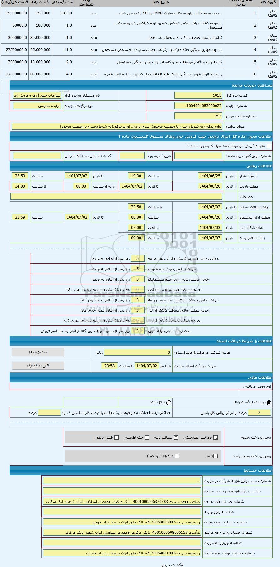 | عنوان مزایده | لوازم یدکی(به شرط رویت و با وضعیت موجود) | |||