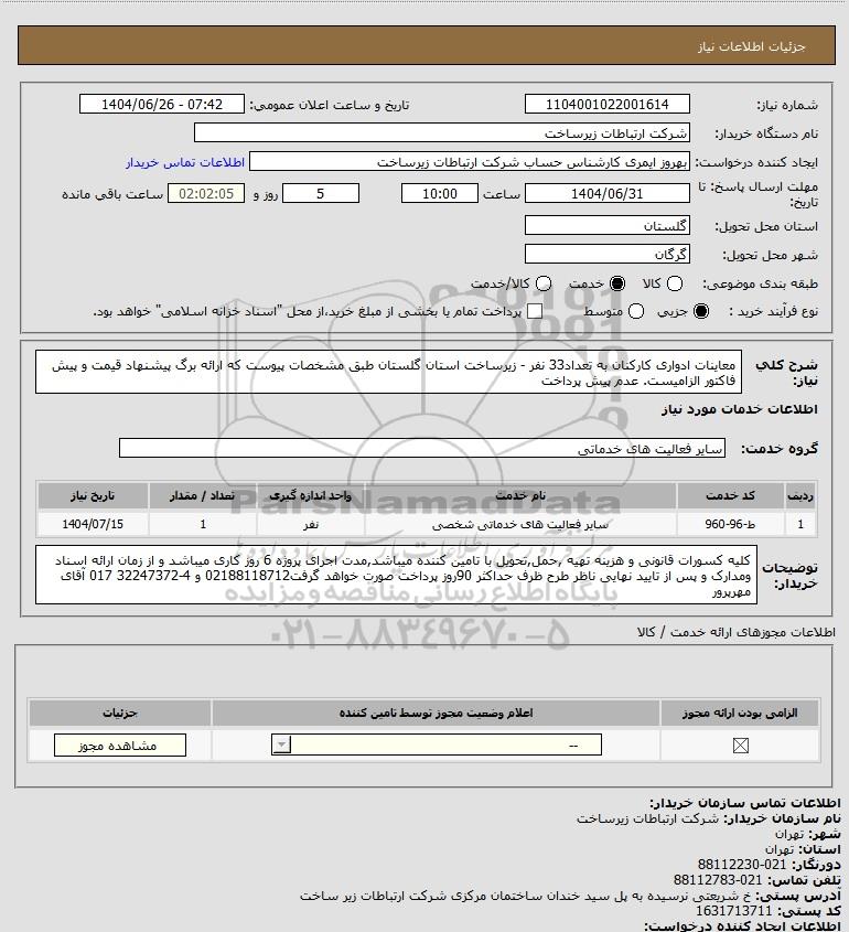 شرح کلی نیاز: معاینات ادواری کارکنان به تعداد33 نفر - زیرساخت استان گلستان طبق مشخصات پیوست که ارائه برگ پیشنهاد قیمت و پیش فاکتور الزامیست. عدم پیش پرداخت