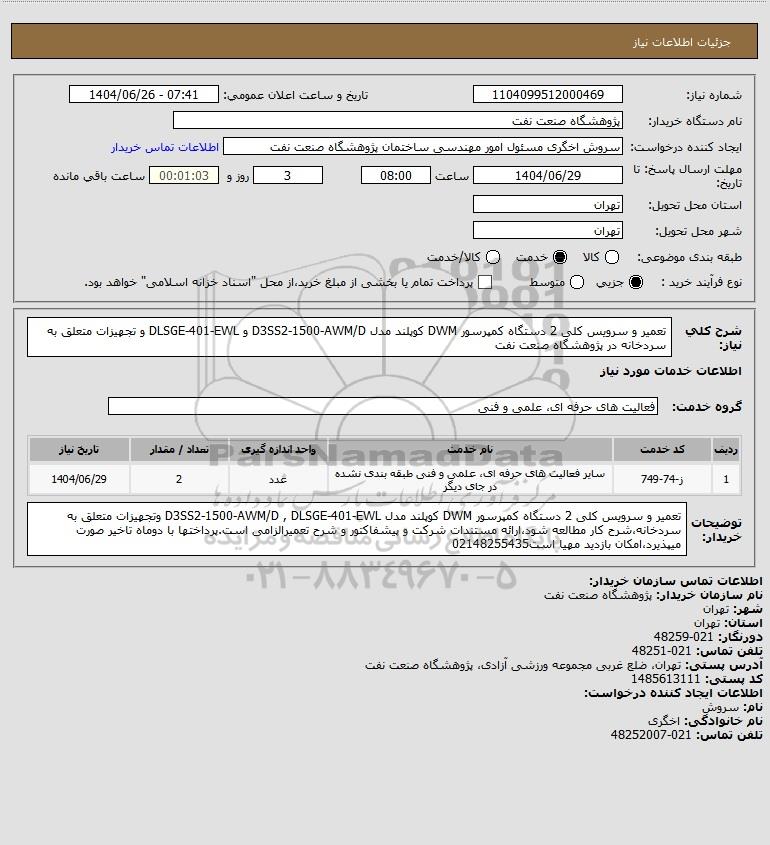 شرح کلی نیاز: تعمیر و سرویس کلی 2 دستگاه کمپرسور DWM کوپلند مدل D3SS2-1500-AWM/D و DLSGE-401-EWL و تجهیزات متعلق به سردخانه در پژوهشگاه صنعت نفت