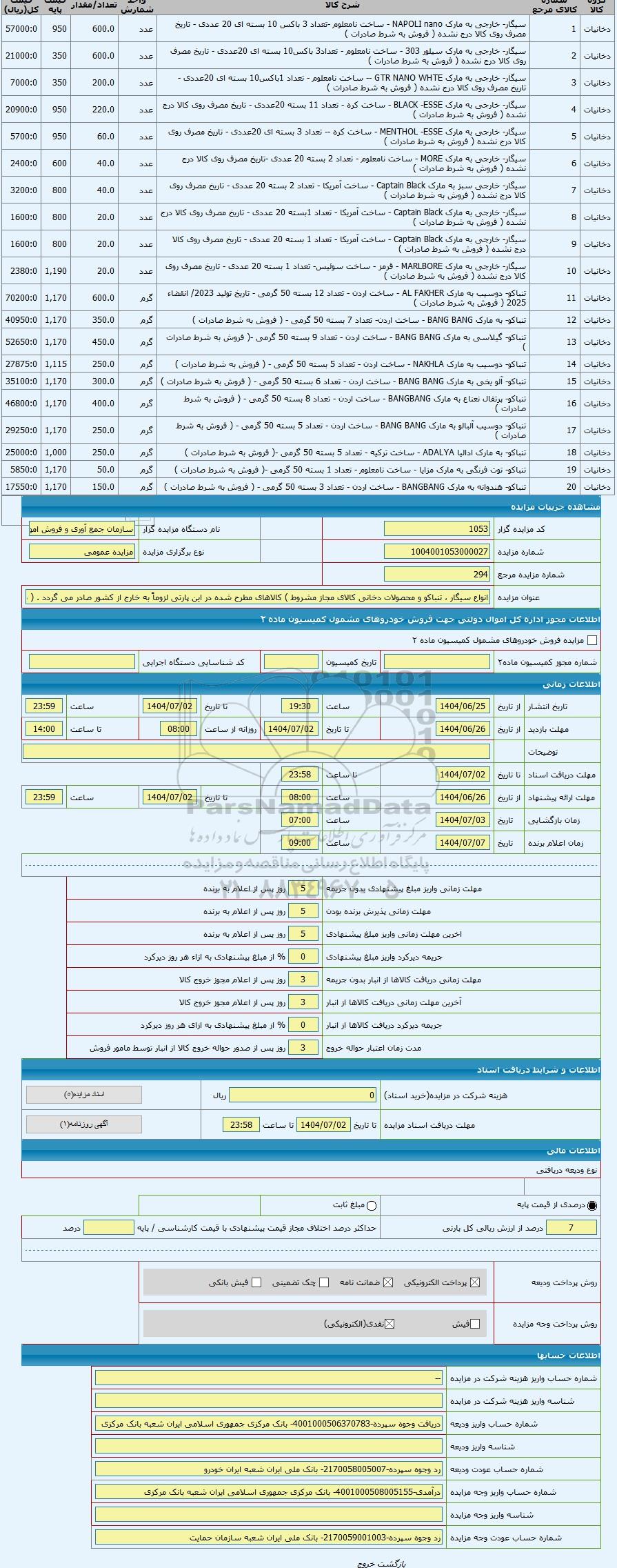 | کد مزایده گزار | 1053 | نام دستگاه مزایده گزار | سازمان جمع آوری و فروش اموال تملیکی | |