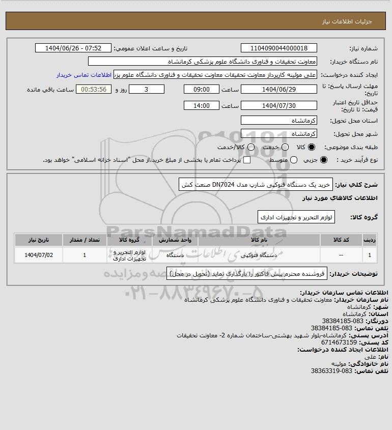 شرح کلی نیاز: خرید یک دستگاه فتوکپی شارپ مدل DN7024 صنعت کش