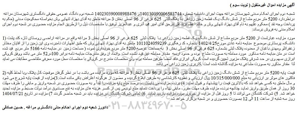 شعبه دوم اجرای احکام مدنی شهرستان مراغه جهت اجرای دادنامه شماره 140130390006583744و 140230390008988476 شعبه دوم دادگاه عمومی حقوقی دادگستری شهرستان مراغه درنظردارد 5200 متر مربع مشاع از شش دانگ یک قطعه زمین زراعی با پلاک ثبتی 625 فرعی از 96 اصلی بخش 3 مراغه متعلق به آقای بهزاد تنهایی وش بخواسته محکومیت مدنی (حکم به پرداخت وجه نقد ) محکوم علیهم به نام آقای بهزاد تنهایی وش و خانم اعظم نژندعلی درحق آقای امیر محمد آذری و عبدالعزیز توفیق با مشخصات ذیل را ازطریق انجام مزایده حضوری در شعبه دوم اجرای احکام مدنی به فروش برساند:
