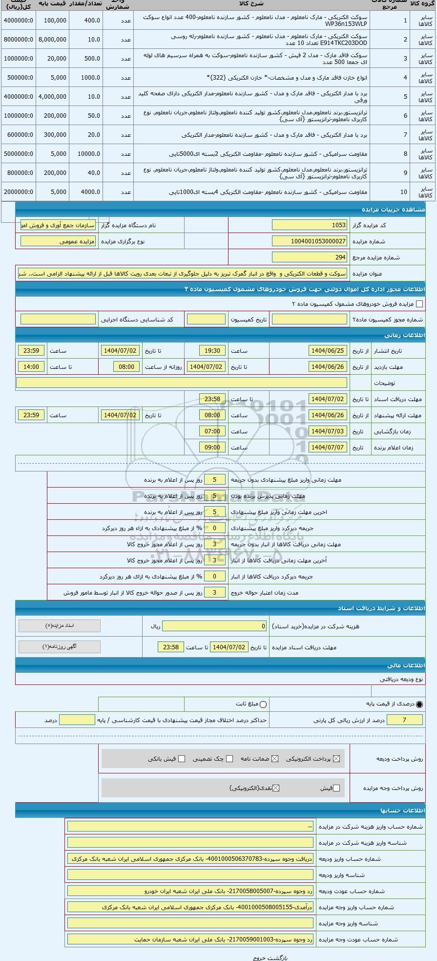 | کد مزایده گزار | 1053 | نام دستگاه مزایده گزار | سازمان جمع آوری و فروش اموال تملیکی | |