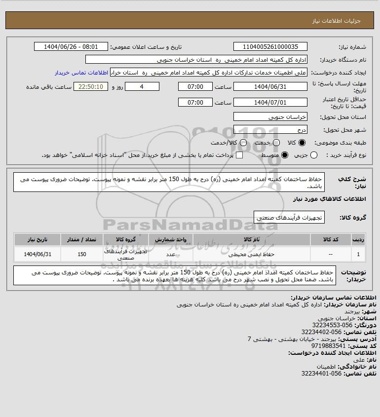 شرح کلی نیاز: حفاظ ساختمان کمیته امداد امام خمینی (ره) درح به طول 150 متر برابر نقشه و نمونه پیوست. توضیحات ضروری پیوست می باشد.