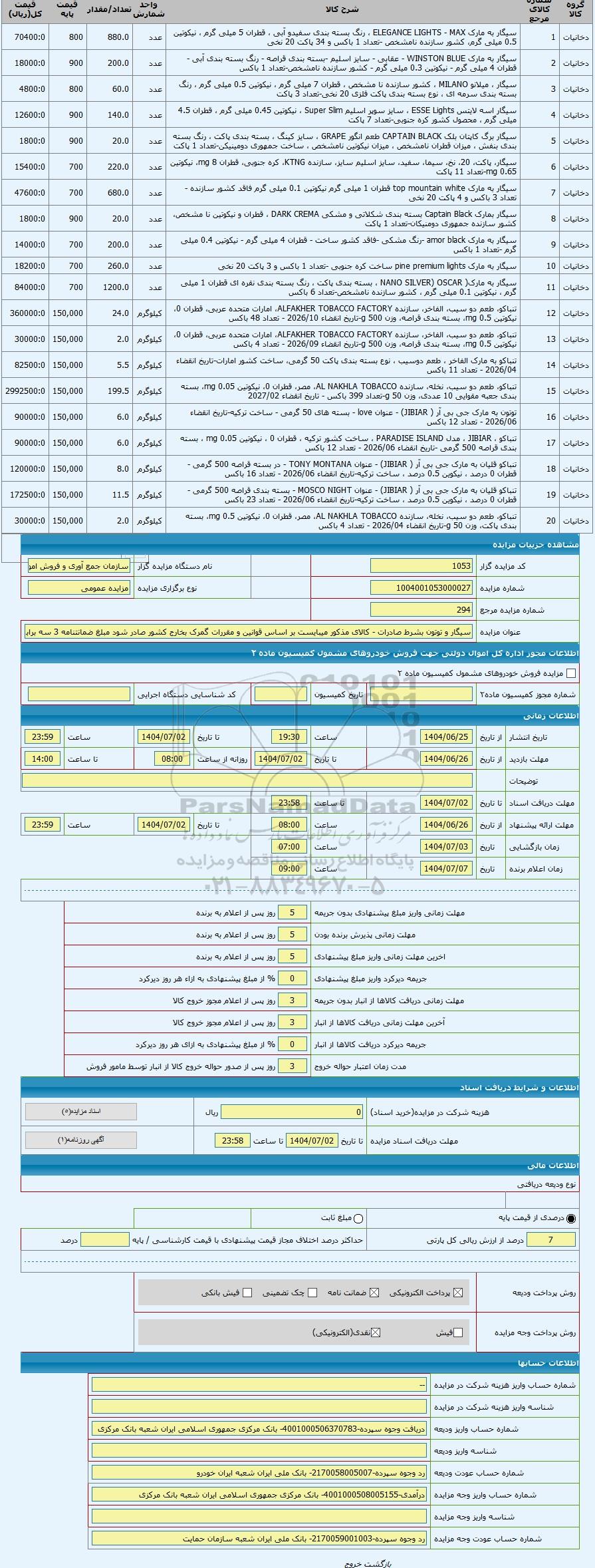 مزایده عمومی مزایده سیگار و توتون بشرط صادرات - کالای مذکور میبایست بر اساس قوانین و مقررات گمرک بخارج کشور صادر شود مبلغ ضمانتنامه 3 سه بر برگزار میگردد. از کلیه افراد متخصص و شرکتهای واجد شرایط دعوت به عمل میآید تا در این مزایده با کد خبرگزاری پارس نماد : 9560003 شرکت نمایند تاریخ شروع مزایده : 1404/06/25 مهلت شرکت در مزایده: تا پایان روز 1404/07/02 مکان برگزاری اموال واگذاری استانهای کرمانشاه و دستهبندیهای مربوط به این حراجی متفرقه میباشد.
