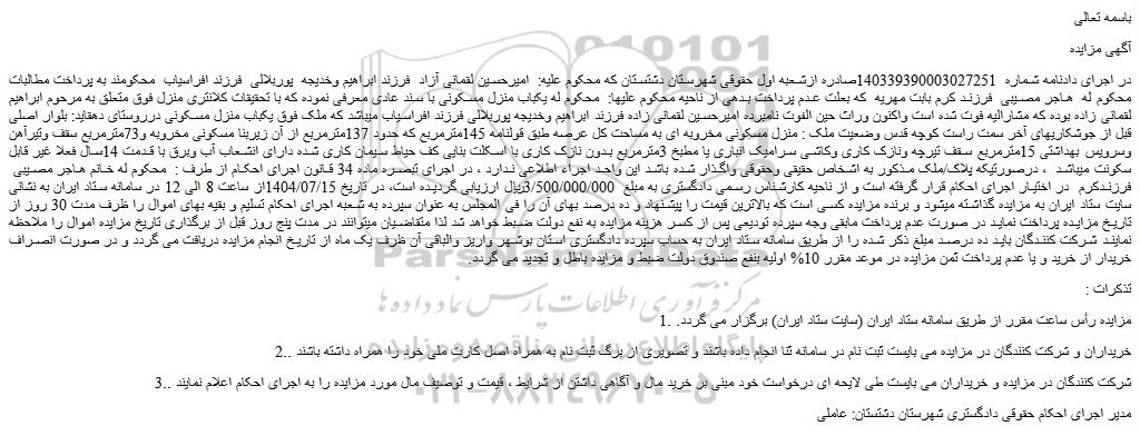 در اجرای دادنامه شماره 140339390003027251صادره ازشعبه اول حقوقی شهرستان دشتستان که محکوم علیه: امیرحسین لقمانی آزاد فرزند ابراهیم وخدیجه پوربلالی فرزند افراسیاب محکومند به پرداخت مطالبات محکوم له هاجر مصیبی فرزند کرم بابت مهریه که بعلت عدم پرداخت بدهی از ناحیه محکوم علیها: محکوم له یکباب منزل مسکونی با سند عادی معرفی نموده که با تحقیقات کلانتری منزل فوق متعلق به مرحوم ابراهیم لقمانی زاده بوده که مشارالیه فوت شده است واکنون وراث حین الفوت نامبرده امیرحسین لقمانی زاده فرزند ابراهیم وخدیجه پوربلالی فرزند افراسیاب میباشد که ملک فوق یکباب منزل مسکونی درروستای دهقاید: بلوار اصلی قبل از جوشکاریهای آخر سمت راست کوچه قدس وضعیت ملک : منزل مسکونی مخروبه ای به مساحت کل عرصه طبق قولنامه 145مترمربع که حدود 137مترمربع از آن زیربنا مسکونی مخروبه و73مترمربع سقف وتیرآهن وسرویس بهداشتی 15مترمربع سقف تیرچه ونازک کاری وکاشی سرامیک انباری یا مطبخ 3مترمربع بدون نازک کاری با اسکلت بنایی کف حیاط سیمان کاری شده دارای انشعاب آب وبرق با قدمت 14سال فعلا غیر قابل سکونت میباشد ، درصورتیکه پلاک/ملک مذکور به اشخاص حقیقی وحقوقی واگذار شده باشد این واحد اجراء اطلاعی ندارد ، در اجرای تبصره ماده 34 قانون اجرای احکام از طرف : محکوم له خانم هاجر مصیبی فرزندکرم در اختیار اجرای احکام قرار گرفته است و از ناحیه کارشناس رسمی دادگستری به مبلغ 3/500/000/000ریال ارزیابی گردیده است، در تاریخ 1404/07/15از ساعت 8 الی 12 در سامانه ستاد ایران به نشانی سایت ستاد ایران به مزایده گذاشته میشود و برنده مزایده کسی است که بالاترین قیمت را پیشنهاد و ده درصد بهای آن را فی المجلس به عنوان سپرده به شعبه اجرای احکام تسلیم و بقیه بهای اموال را ظرف مدت 30 روز از تاریخ مزایده پرداخت نماید در صورت عدم پرداخت مابقی وجه سپرده تودیعی پس از کسر هزینه مزایده به نفع دولت ضبط خواهد شد لذا متقاضیان میتوانند در مدت پنج روز قبل از برگذاری تاریخ مزایده اموال را ملاحظه نمایند شرکت کنندگان باید ده درصد مبلغ ذکر شده را از طریق سامانه ستاد ایران به حساب سپرده دادگستری استان بوشهر واریز والباقی آن ظرف یک ماه از تاریخ انجام مزایده دریافت می گردد و در صورت انصراف خریدار از خرید و یا عدم پرداخت ثمن مزایده در موعد مقرر 10% اولیه بنفع صندوق دولت ضبط و مزایده باطل و تجدید می گردد.