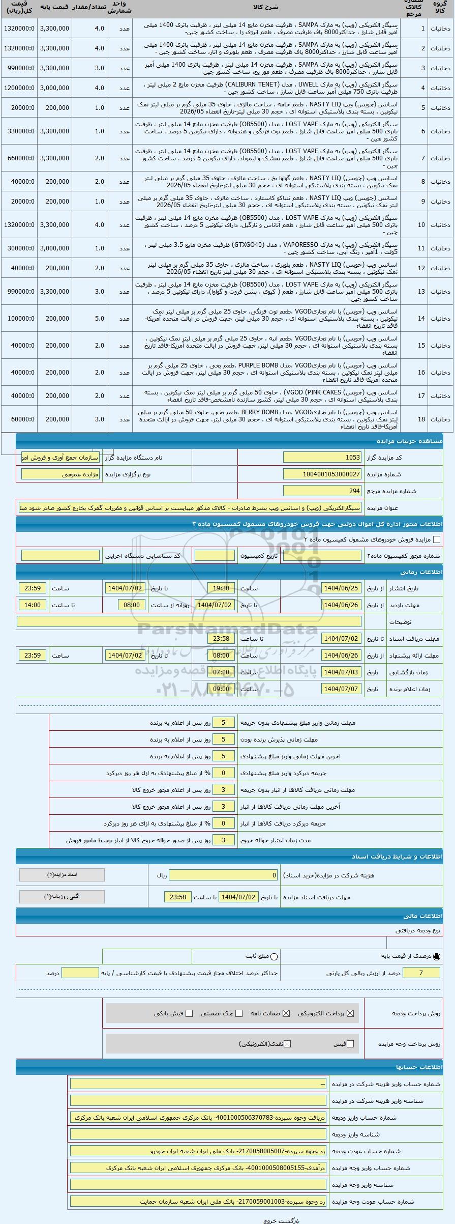 | عنوان مزایده | سیگارالکتریکی (ویپ) و اسانس ویپ بشرط صادرات - کالای مذکور میبایست بر اساس قوانین و مقررات گمرک بخارج کشور صادر شود مبلغ ضمانتنامه 3 سه برابر ارزش کالا از خریدار اخذ میگردد | |||