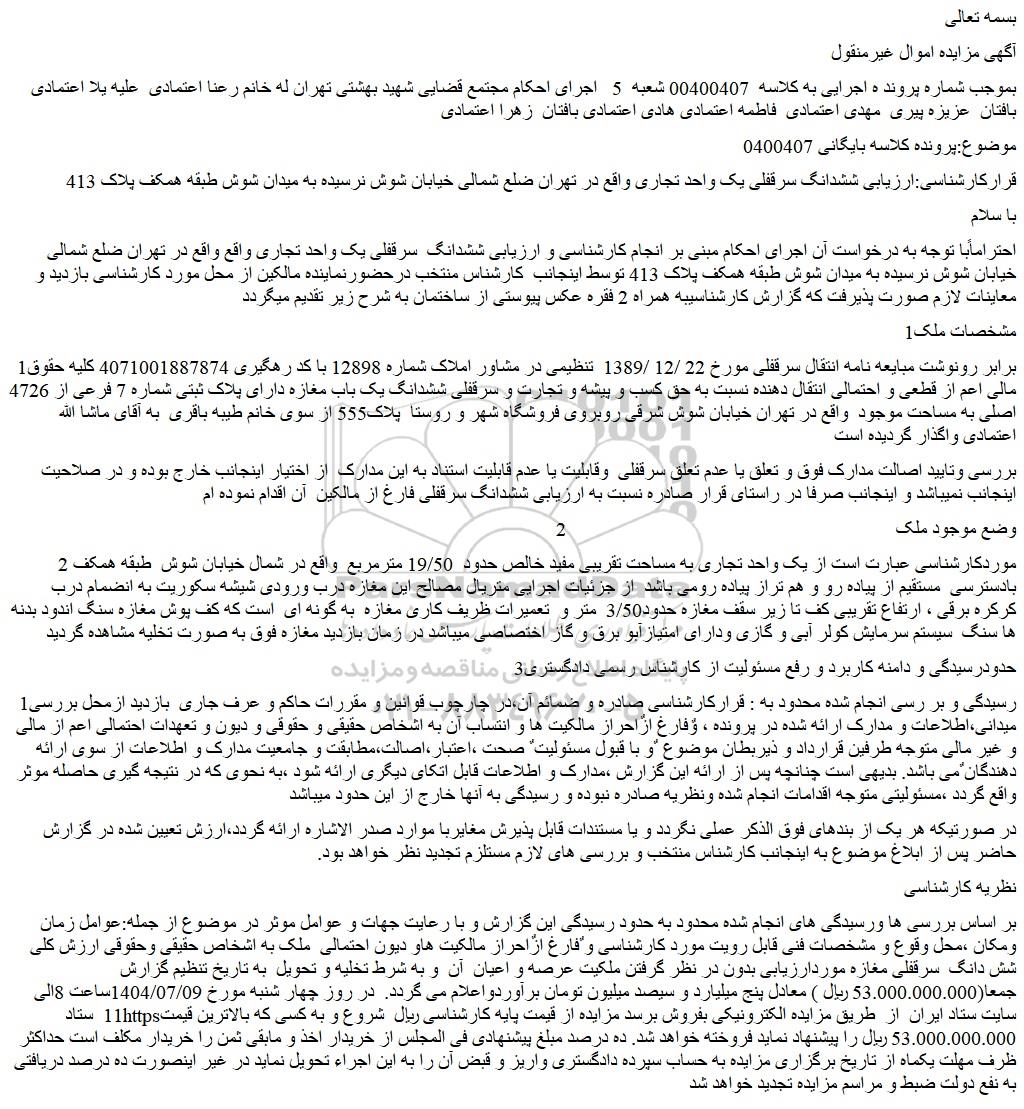 مزایده ششدانگ سرقفلی یک واحد تجاری, مزایده ششدانگ سرقفلی یک واحد تجاری